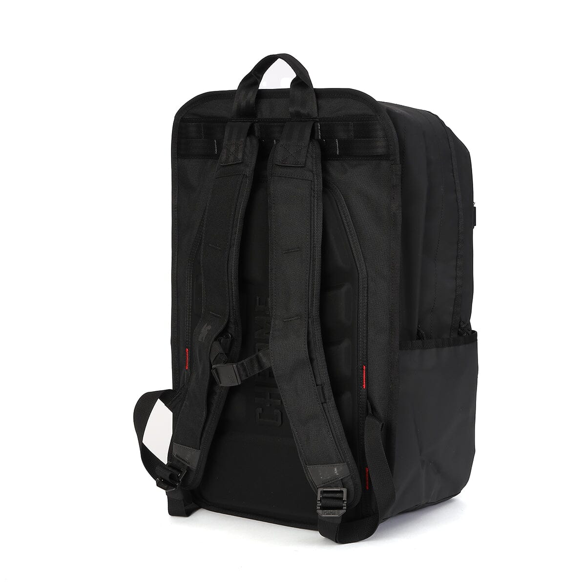 | 立体成形のEVAパネルが通気性を確保してくれる。 | 取り外し可能なフロントストラップが付属。 着替えなど入りきらない荷物をバッグに固定できる。 |