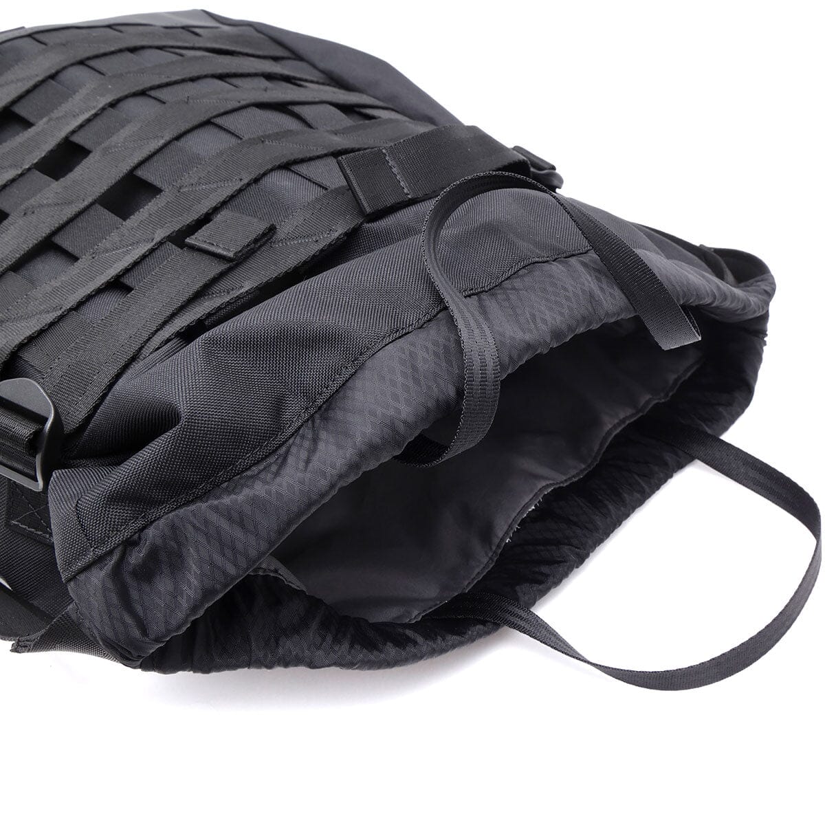 エクストラの荷物を収納できるカーゴネット ドローコードに23mmのストラップを使用することで、肩への負担を和らげる。