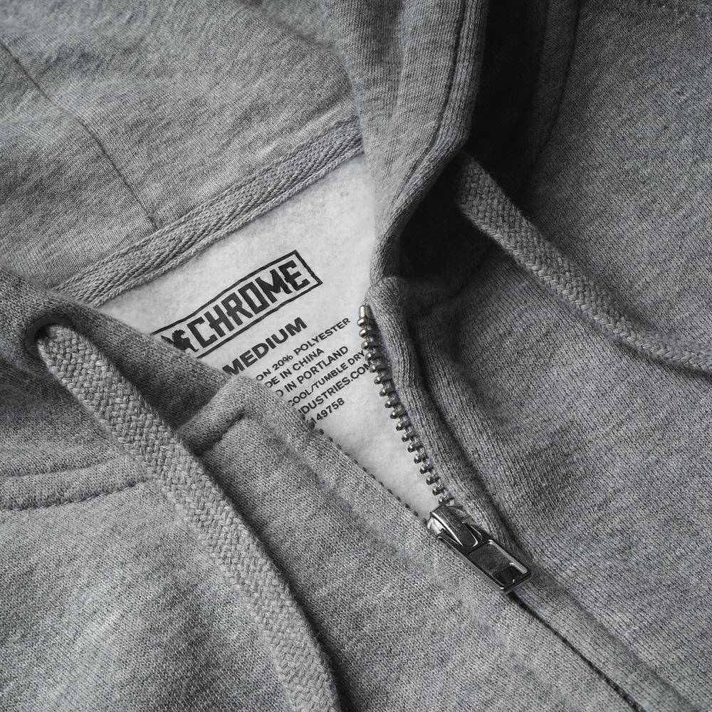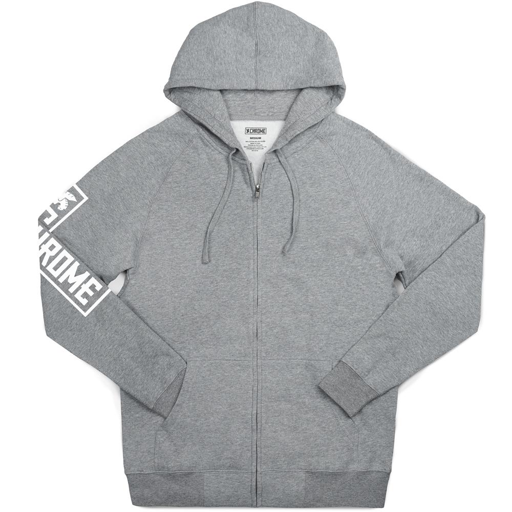 肉厚なコットンを汎用性の高いジップ フーディー。 右袖にCHROMEロゴ プリント